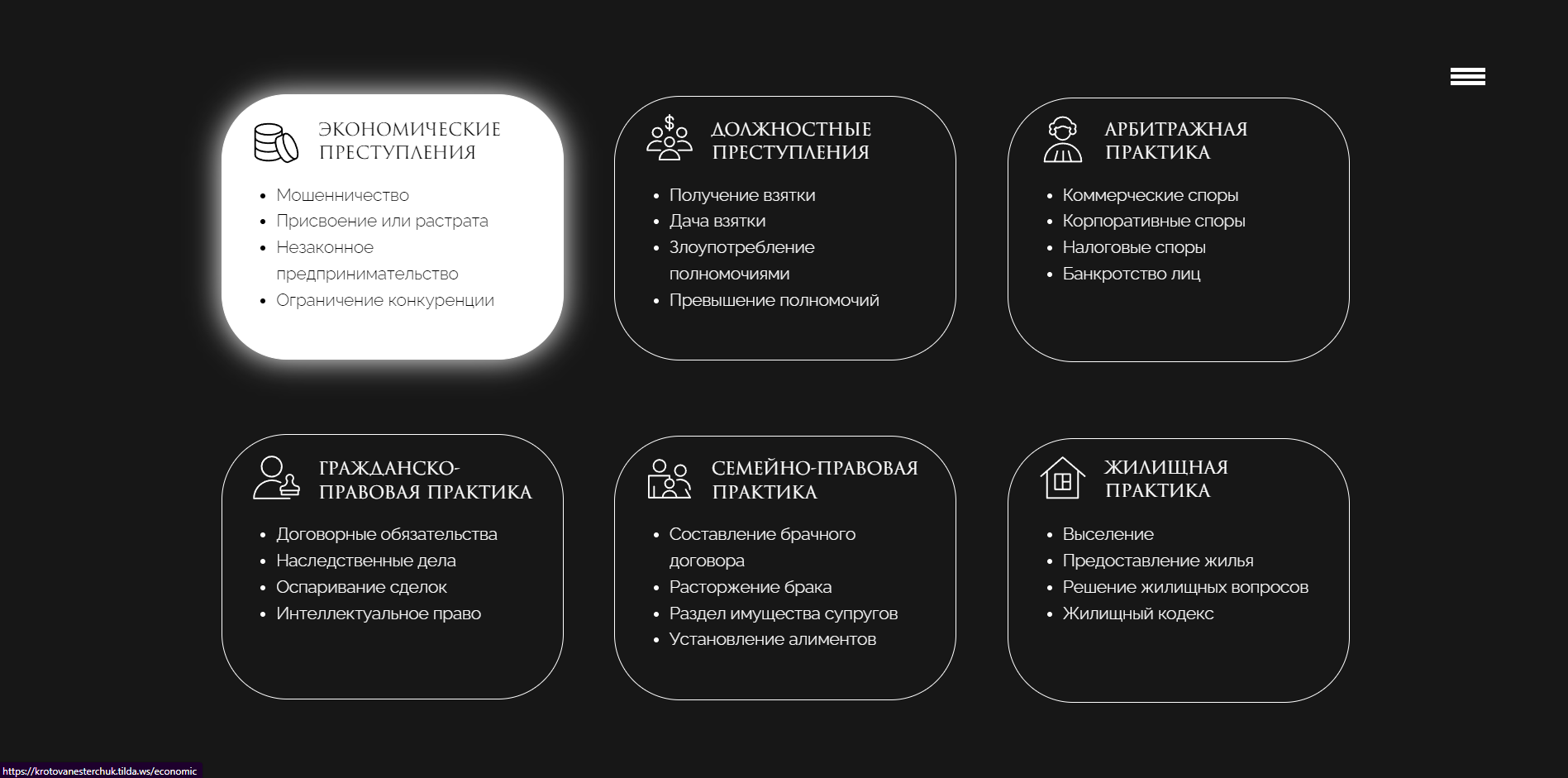 Как выделиться среди конкурентов? Довольно банальный, но в тоже время насущный вопрос. В контексте адвокатского дела моё решение заключалось в простоте. В то время как аналогичные сайты наполнены большим количеством "профессиональной" информации, мы решили акцентировать внимание пользователя на более конкретных и понятных аспектах. Таким образом, посетив страницу нашего агентства, человек не только с лёгкостью сможет подобрать специалиста, но и будет иметь чёткое представление в каких вопросах адвокат сможет ему помочь.
